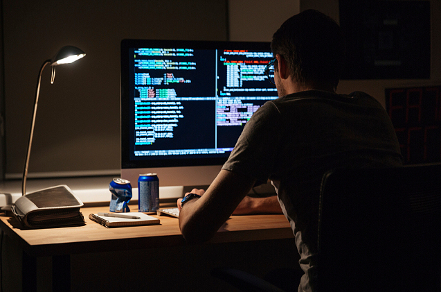 Back view of modern programmer sitting and writing code in dark room